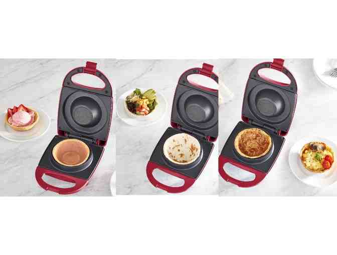 Make 4-inch bowl-shaped waffles for sweet treats that hold ice cream, berries, and more. Can also make tortillas into mini taco bowls and hashbrowns into mini breakfast bowls. Dual nonstick surfaces heat evenly so each waffle bowl lifts cleanly. Includes recipe guide and two 3.5 ounce package of Epicure caramel sauce mix.