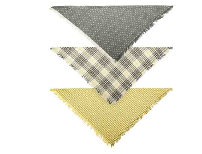 A set of three large pet bandanas featuring polka dot, plaid, and stripe designs and fashionable fringed trim. Bandanas are folded on a kraft paper card and packaged in a protective polybag. Package includes an insert with instructions for use. Bandanas are 38" x 18" and fit necks up to 30". Machine-washable. 100% cotton