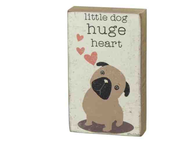 A rustic-inspired wooden block sign featuring a "Litte Dog - Huge Heart" sentiment with dog and heart designs. Contains predrilled back keyhole for easy hanging or can free-stand alone.