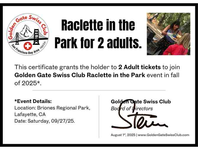 2 Adult tickets for Golden Gate Swiss Club (GGSC) "Raclette in the Park" event on 9/27/25. “Raclette in the Park” is a cherished GGSC custom that dates back decades.