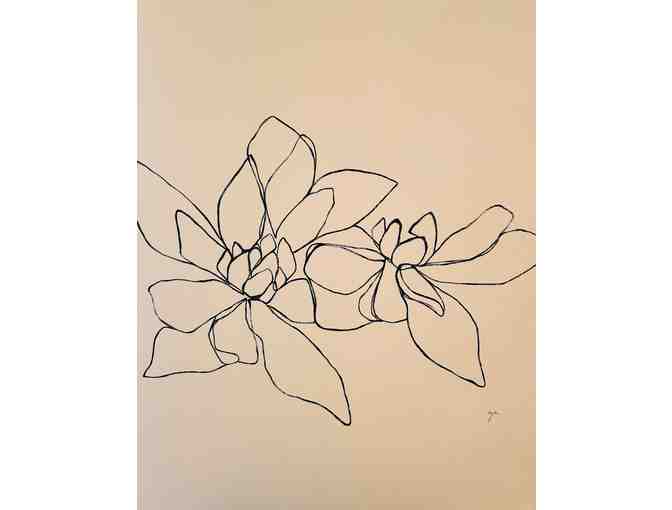 24” by 30” original acrylic on canvas, capturing magnolia flowers in a minimalistic continuous line exudes a sense of organic beauty and elegance through its simplicity. The flowing, uninterrupted lines capture the essence of the magnolia blooms with graceful fluidity, creating a serene and captivating composition. The choice of medium and style adds depth to the portrayal, inviting viewers to immerse themselves in the delicate charm of nature’s splendor.