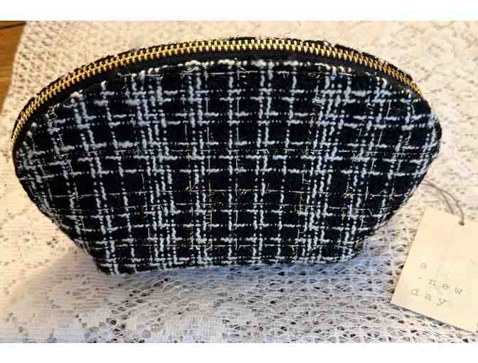 Pretty black and white clutch with gold accents, perfect for those holiday parties. There is a small pocket inside for keys etc. Clutch measures 8x5 ½ inches.