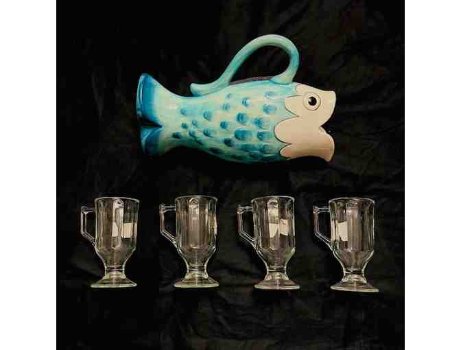 Enjoy the Ocean year-round!  5 pieces total: you won't find this anywhere else.  Whimsical Ceramic "Fish Pitcher" is beautiful teal and white colored, with a handle for pouring. (Pitcher size is 12.5" H and 9" wide.)  This set also includes 4 sturdy/solid (and matching) "teal-tinted" glasses with handles (Size 6" x 4.5").  So unique!  Item may be shipped nationwide to Winning Bidder (with insurance) - or may be picked up for FREE in Enfield, CT.  Such a FUN item!