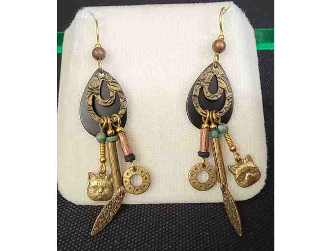 Step back into the '90s with these charming vintage dangle earrings featuring a whimsical cat design in black and brass tones. Though unmarked, they closely resemble the distinctive style of Silver Forest earrings—elegant, artsy, and full of personality.