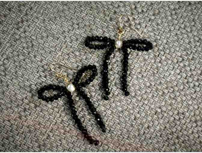 Sophisticated and striking, these handcrafted Black Onyx Earrings bring together elegance and artistry in perfect harmony. Measuring 1.7" wide by 1.4" long, each earring features meticulously cut black onyx beads (4mm x 2mm) shaped into a graceful bow, accented with a luminous fresh pearl at the center. The gold-plated hooks provide a refined finish, making these earrings a timeless statement piece suitable for both special occasions and everyday elegance.