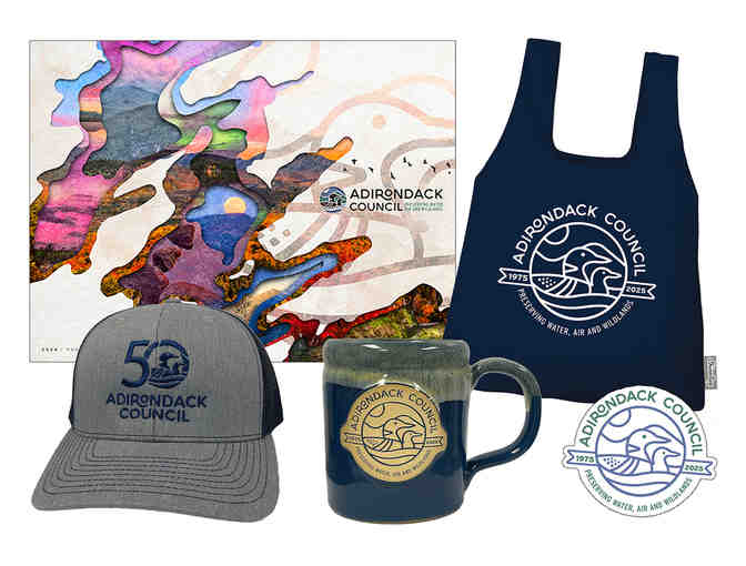 In recognition of the Adirondack Council's 50 years of conservation and advocacy work on behalf of the Adirondack Park, each gift basket includes: Reusable ChicoBag Tote (1), 2026 Forever Wild Calendar (1), Handcrafted Loon Mug (1), Trucker Hat (1), 50th anniversary publication, sticker and pen.