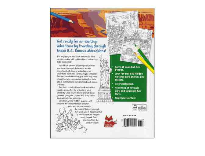 Hidden Picture Puzzle book featuring National Parks and famous places to visit throughout the USA. Lots of fun and educational facts and plenty of hidden items. Great for road trips and all ages who enjoy exploring and learning about our country!