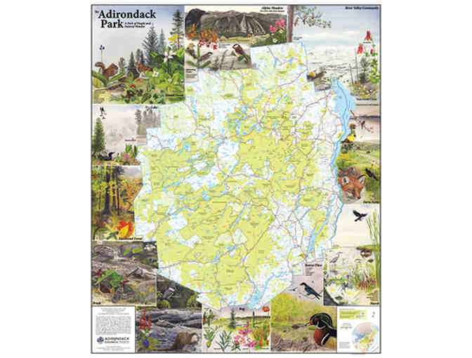 3rd Edition Adirondack Park map showing public and private lands, wilderness areas, mountains, rivers, towns and highways. The map is bordered by beautiful, detailed watercolor illustrations by artist Anne Lacy depicting various habitat found in the Park: alpine meadow, river valley, marsh, bog, river, brook, hardwood forest, lake and boreal forest. Measures: 35" x 43"