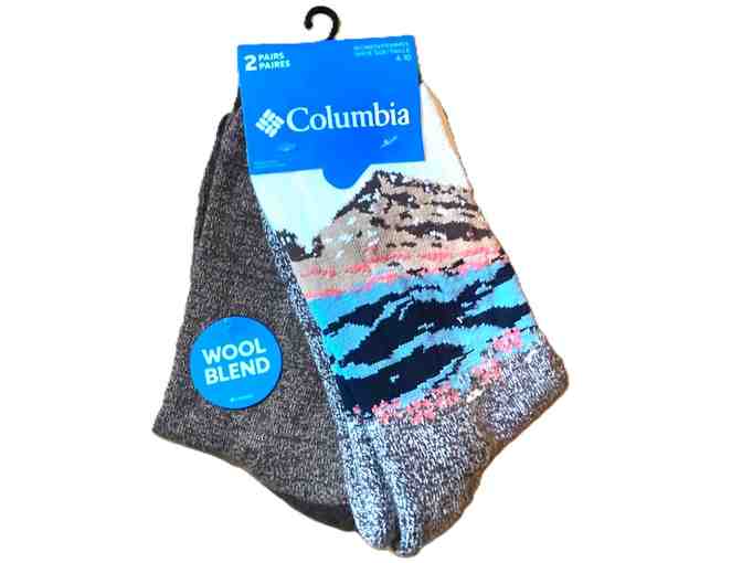 Put your best foot forward in these wool-blend crew socks from Columbia. 68 percent polyester, 17 percent acrylic, 12 percent wool, 3 percent other fibers. One pair of mountain view and one pair of heather brown. Makes a great winter boot sock.