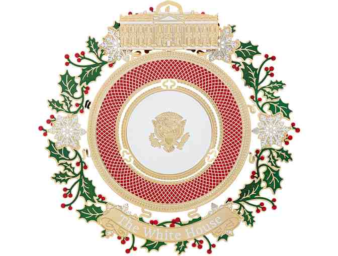 "EXCEPTIONAL PACKAGING - Presented in a stunning red keepsake box (5 1/8” x 5 7/8” x 1”) with gold accents, this collectible includes a festive hanging ribbon and an illustrated booklet detailing 150 years of White House State Dinners and the history of White House State China Services."