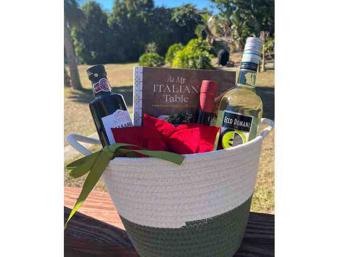 This Basket starts with Italian Wine, Balsamic vinegar, Olive oil, and At My Italian Table cookbook by Laura Vitale! Everything you need to make a Great Meal! PLUS, a Nora Fleming Chip and Dip Tray! Bid Bid Bid!