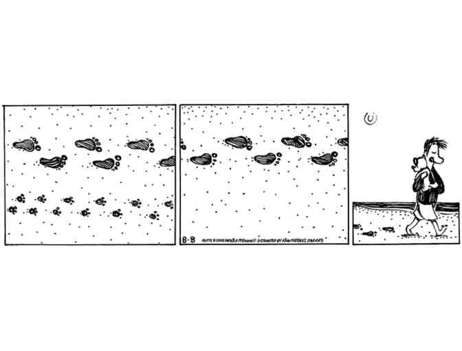 In this August 8, 2008 MUTTS comic, a set of footprints is alongside a set of pawprints on the beach. The pawprints stop but the footprints continue and we see that Ozzie has picked up Earl and holding him as he walks.