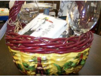 Original Design Decoupage Basket by Jeanne Bennett with wine motif. Basket includes Black Dog wine, 2 glasses, corkscrew, wine stopper and beverage napkins.