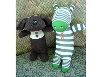 These adorable friends, Hickory and River, are products of the sock doll renaissance, relatives of the original sock monkeys. They are part of the Buttons & Socks collection. Completely handsewn by an Albuquerque artist, they are made from brand new socks, stuffed with non-allergenic fiberfill, and adorned with buttons, four of which  are collectible. The dog is 13 inches long, and the hippo is 19 inches.