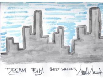 This one a kind 9x12 inch watercolor painting of New York was done by Mr. Donald Trump. The watercolor painting with the inscription ''Dream Big'' is also signed by Mr. Trump. An 8x10 color Autographed Photo of Mr. Trump with the inscription ''Think Big '' is also signed by Mr. Trump.