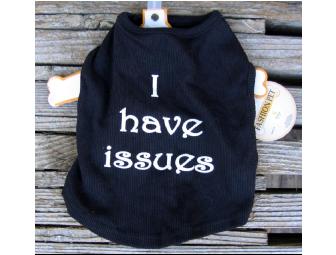Adorable black dog shirt with the saying "I Have Issues" on the back. Size Small 10"-12". Measure your dog from the base of the neck to the base of the tail.