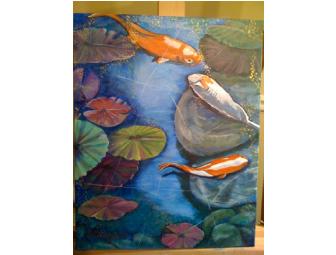 A 16 x 20 modern acrylic original showcasing Koi fish swimming under water from local artist Debbie Unverzagt.