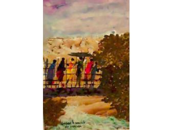 Lawson Sworh is a Liberian with the Episcopal Church of Liberia, who paints these incredibly vivid images of his native country. He was a student that benefited from Rev. Abby Flemister's scholarship work, and now shares his culture, country and faith through his art. Biblical connections are striking in each of his paintings. The painting donated for the silent auction is called "Crossing the Monkey Bridge" and shows people heading in a purposeful direction. Perhaps after a day of work, but perhaps after being away for a longer period. The living water (Baptism) flows enthusiastically below. The hillsides are barren...and may represent a wilderness. They also can represent the destruction that not only Liberians but people in various parts of the world now deal with, bringing new plants and new life to the landscape. And most of all, the people are traveling in community. It looks like there are men and women, each with a different load to carry. Wherever they travel they are on the path together and can support each other.
