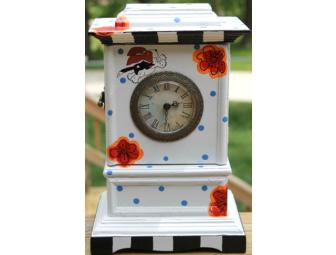 This adorable mantel clock is an upcycled Karin Smith original. It is painted in an adorable flower blue polka dot theme with a Tri colored Basset friend flying over the 10-11-12 positions of the clock. The front face of the clock opens to reveal a hidden compartment for all your treasures or keys. The clock 12.5"Hx7.5"W.