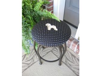 Stool is made of light weight metal with padded seat upholstered in home decorator's fabric. Black with tan square accents and embroidered with a full body Bichon. A truly beautiful piece to add to any decor.