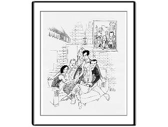 This limited edition of the Al Hirschfeld drawing of "Friends" cast features the cast (Courteney Cox Arquette, Matthew Perry, Jennifer Aniston, David Schwimmer, Matt Le Blanc, Lisa Kudrow) in their famous living room with the Executive Producer, Kevin S. Bright '76, Marta Kauffman, and David Crane, looking in.  The style is consistent with Hirschfeld's unique style, pure line with simple black ink on white paper with little to no shading or crosshatching. His drawings always manage to capture a likeness using the minimum number of lines. This hand-signed, limited-edition lithograph is 26" x 18" and is framed and matted.