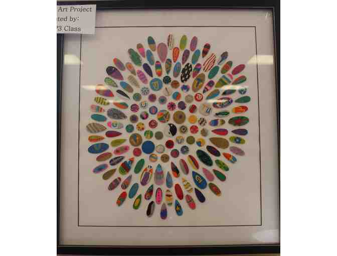 Primary 3 students painted small wooden ovals, teardrops, and circles with brightly colored paint pens. Each student contributed several pieces, and they all decorated at least one shap with The University of Tulsa Hurricane blue and gold, giving the piece an overall TU theme. The finished colorful pieces are assembled into a starburst design on watercolor paper, and the art was professionally framed at Ziegler's.
