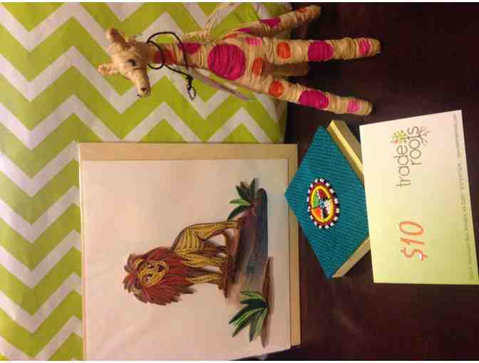 Enjoy this Trade Roots Bundle: $10 gift card, toy giraffe, post-it holder and a lion quilling card.