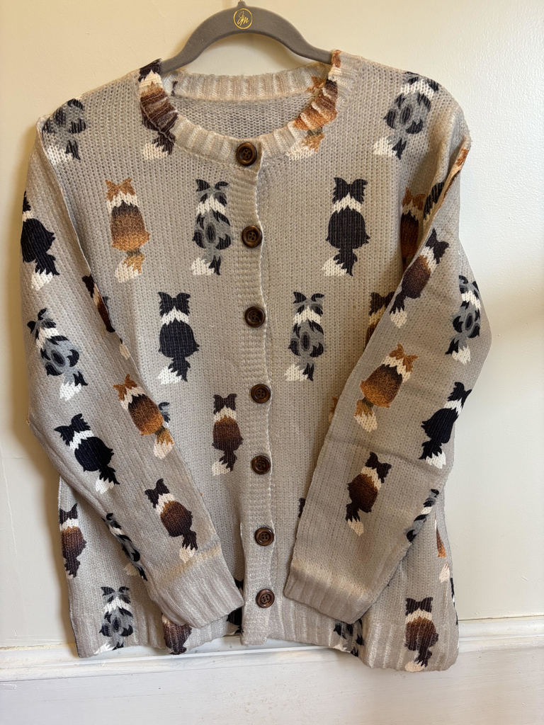CARDIGAN SWEATER-LIGHT TAN WITH DOGS-SIZE M