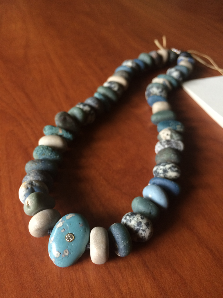 Stunning Leland Bluestone and Lake Michigan Beach Stone Necklace by Becky Thatcher Designs. This Beautiful necklace features beads made from stones pulled right off a Lake Michigan Beach. One bead has a bevel-set .06 ct diamond.