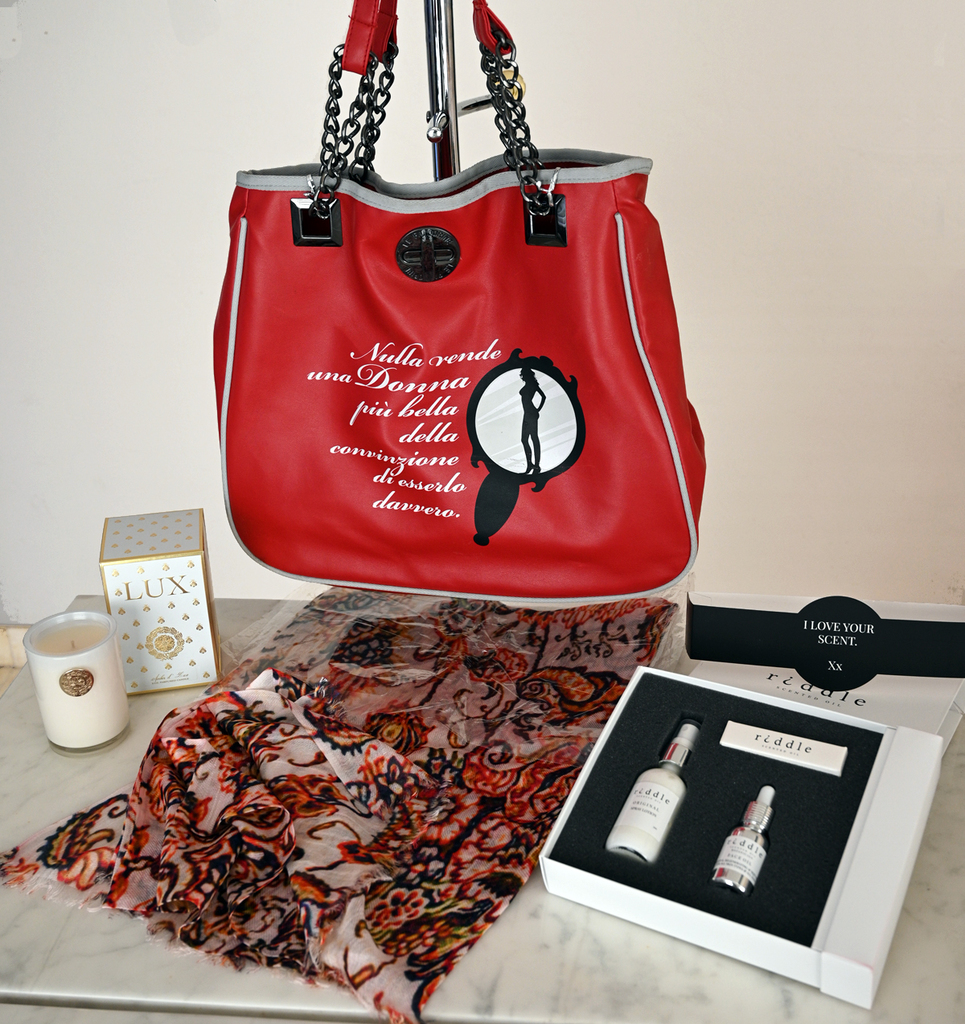 The saying on the front of the bag is: "Nulla vende una Donna piu bella della convinzione di esserlo davvero."