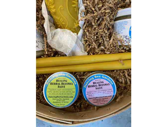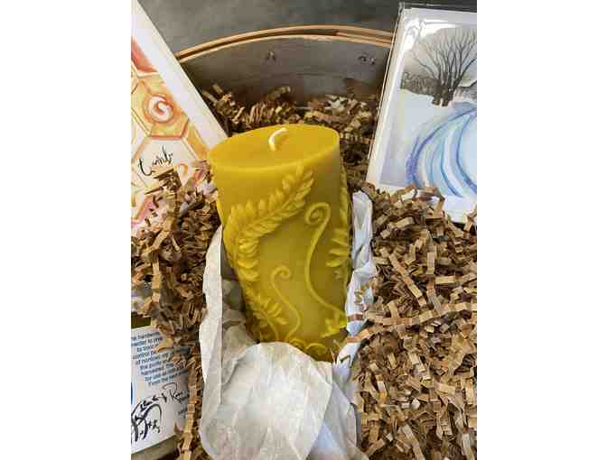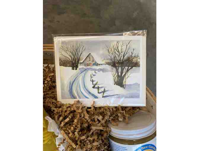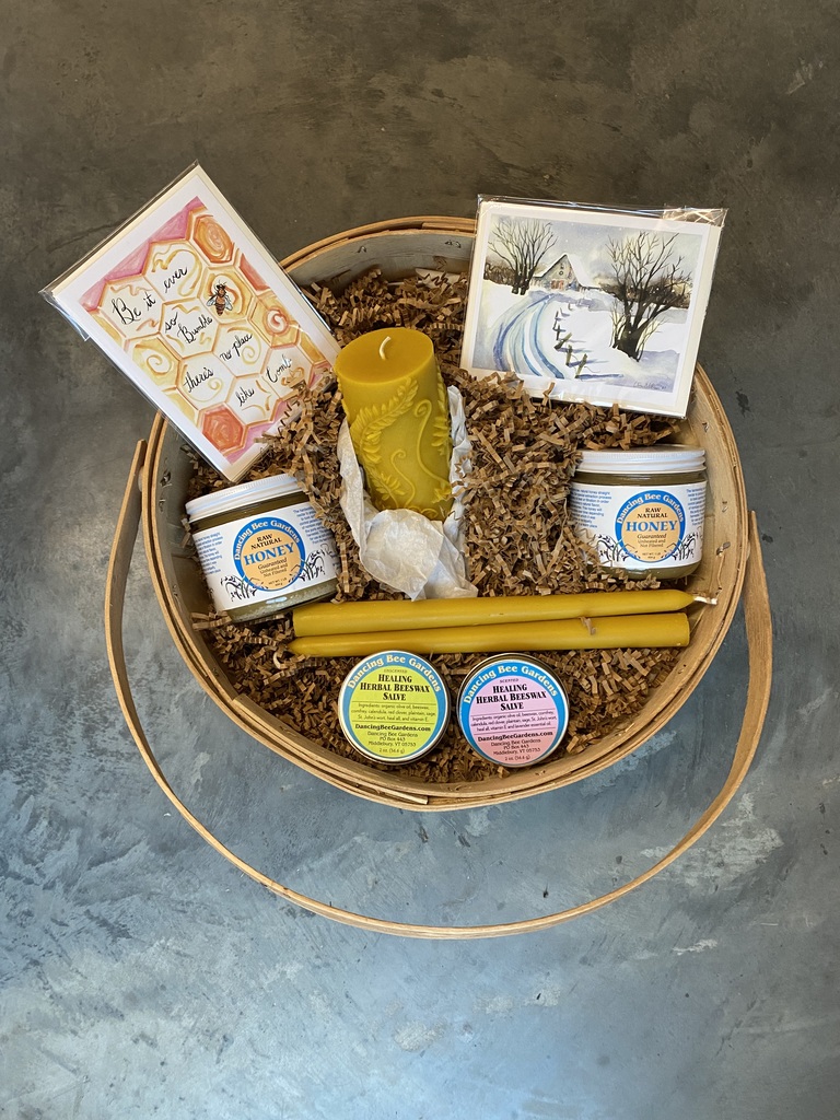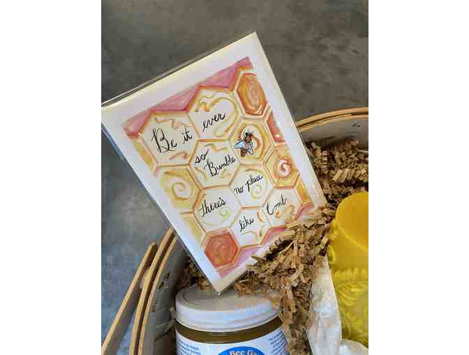 A gift basket of honey-related products and art from Ross Conrad and Alice Eckles of Dancing Bee Gardens.