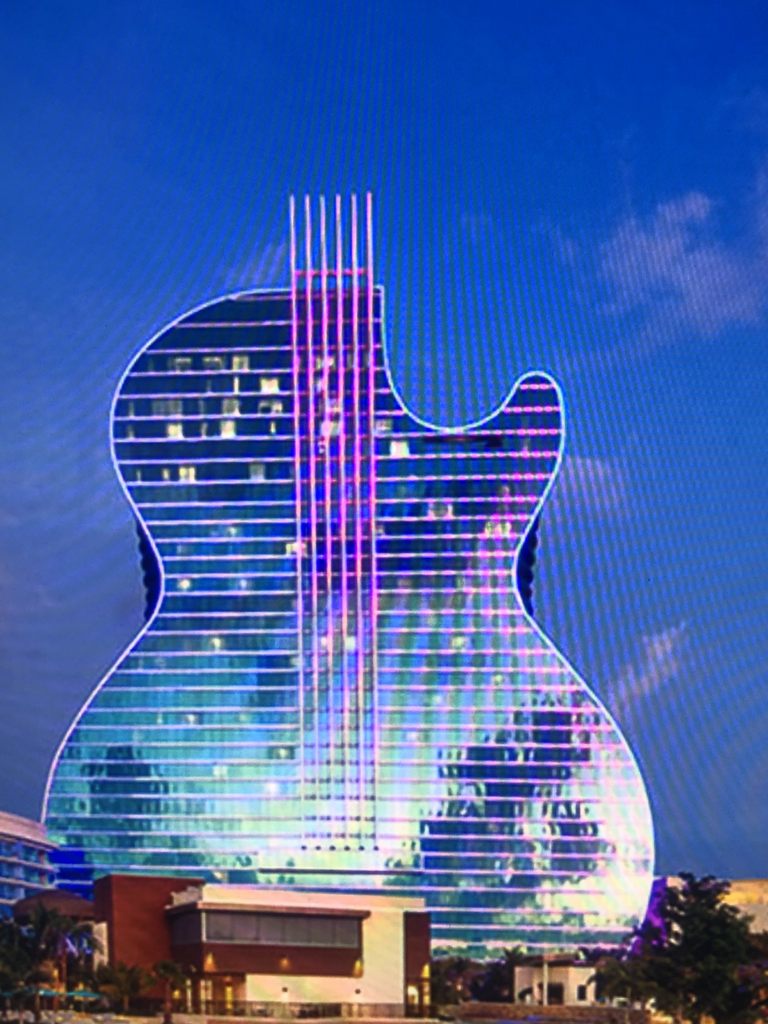 The Guitar Hotel brings 638 luxury guestrooms and suites to the resort. Designed to resemble back-to-back guitars, complete with guitar faces and brightly lit strings, this engineering masterpiece reaches 450 feet into the sky, outfitted with floor-to-ceiling glass panes. Boasting the sun-filled and sunset-laden South Florida skies, The Guitar Hotel is truly an architectural marvel that redefines the South Florida skyline.