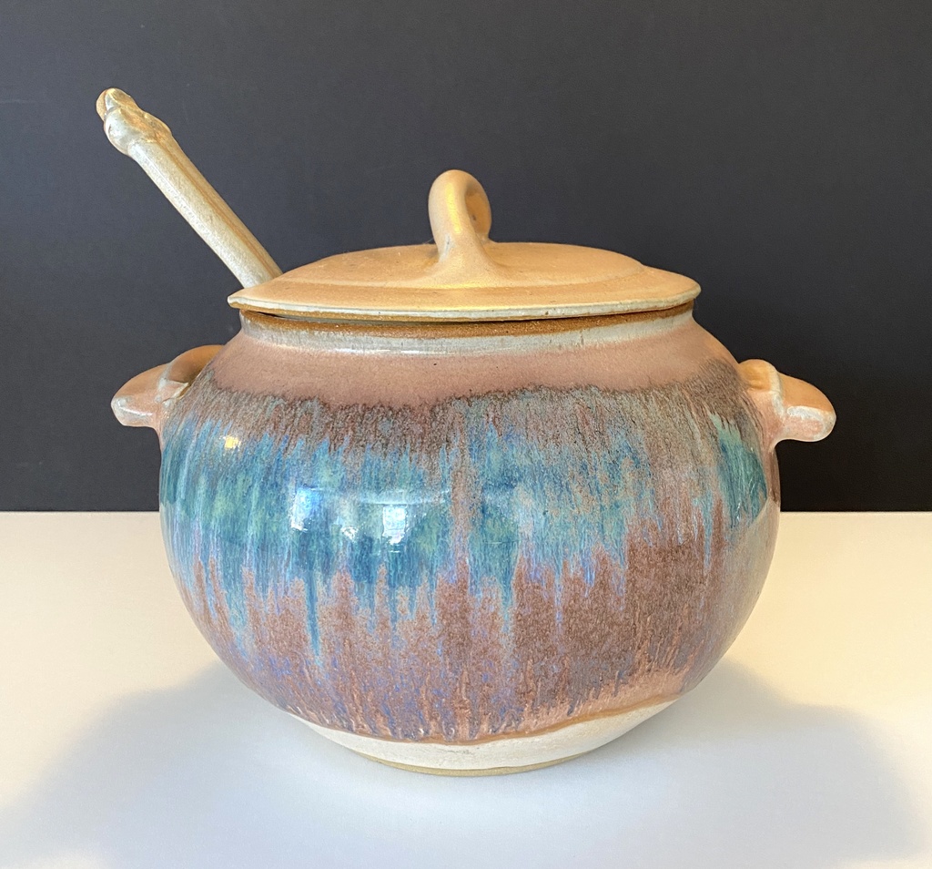 Handmade ceramic soup tureen & ladle with pink and blue glazes.