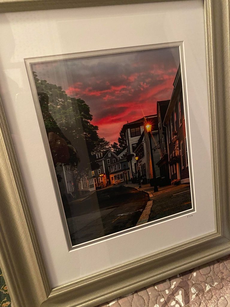 FRAMED PHOTOGRAPHY OF SUNSET LOOKING UP STATE STREET BY DM, 14 1/2 INCHES BY 17 1/2 INCHES - BEAUTIFUL SHOT!!! (SORRY FOR REFLECTIONS)