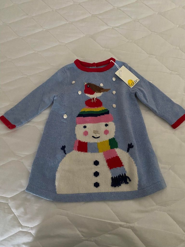 MINI BODEN SWEATER DRESS - SIZE 3-6 MONTHS WINTER DESIGN - BIRD ON SNOWMAN'S HEAD, SNOWBALL DETAILS! LIGHT BLUE WITH RED TRIM. TWO SMALL BUTTONS ON UPPER NECK BACK