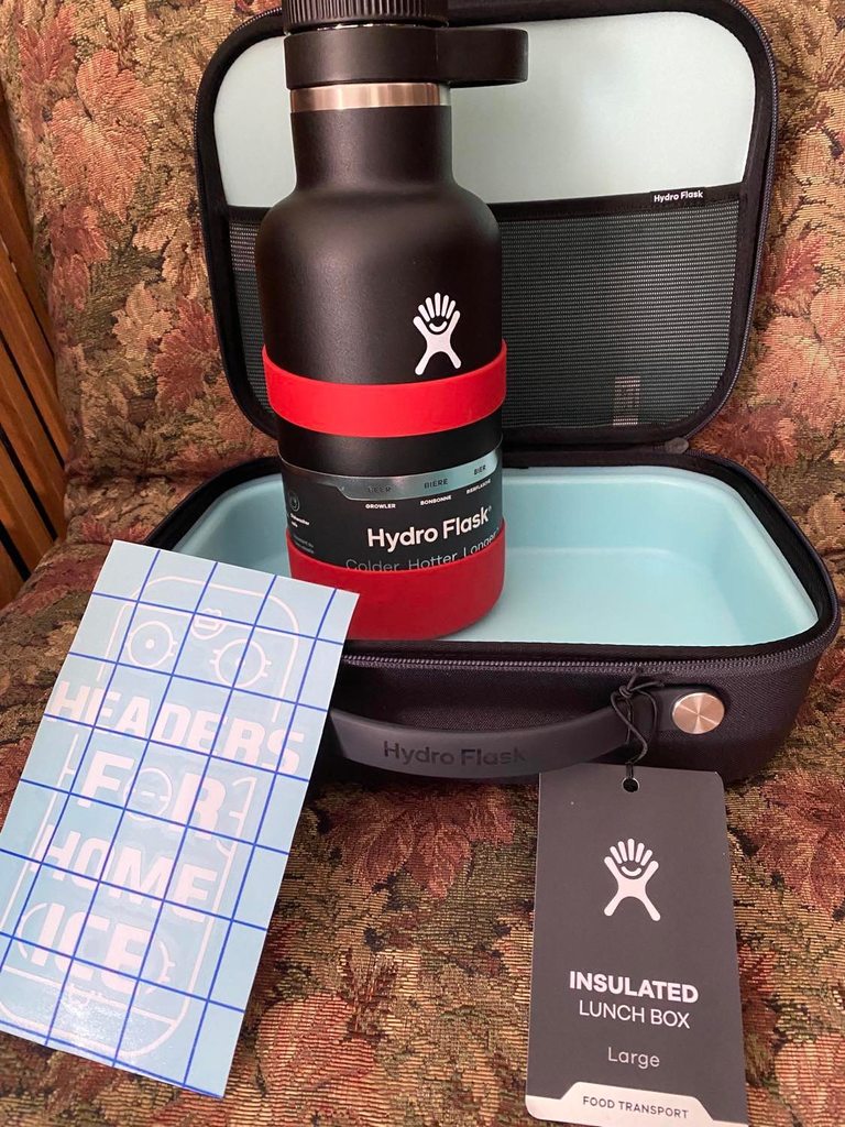 BLACK HYDRO FLASK GROWLER (64 OUNCES) WITH RED TRIM...AND LARGE (5 L) BLACK HYDRO FLASK LUNCHBOX, INCLUDES HEADERS FOR HOME ICE DECAL...SEE PICTURES!