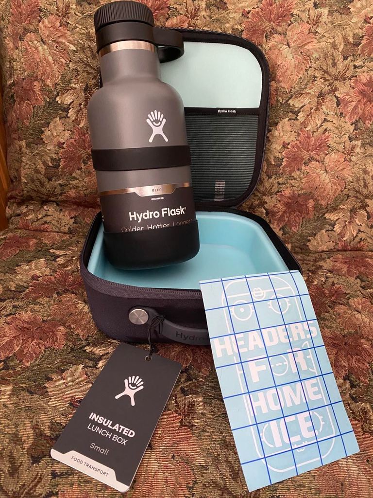 GREY HYDRO FLASK GROWLER (64 OUNCES) WITH BLACK TRIM...AND SMALL BLACK HYDRO FLASK LUNCHBOX (3.5 L)