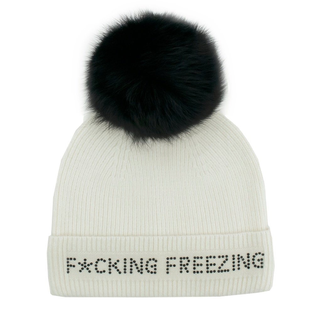 F*CKING FREEZING WHITE HAT WITH BLACK POM POM and BLACK CRYSTALS! ONE SIZE FITS ALL - VISCOSE AND ACRYLIC, VERY SOFT