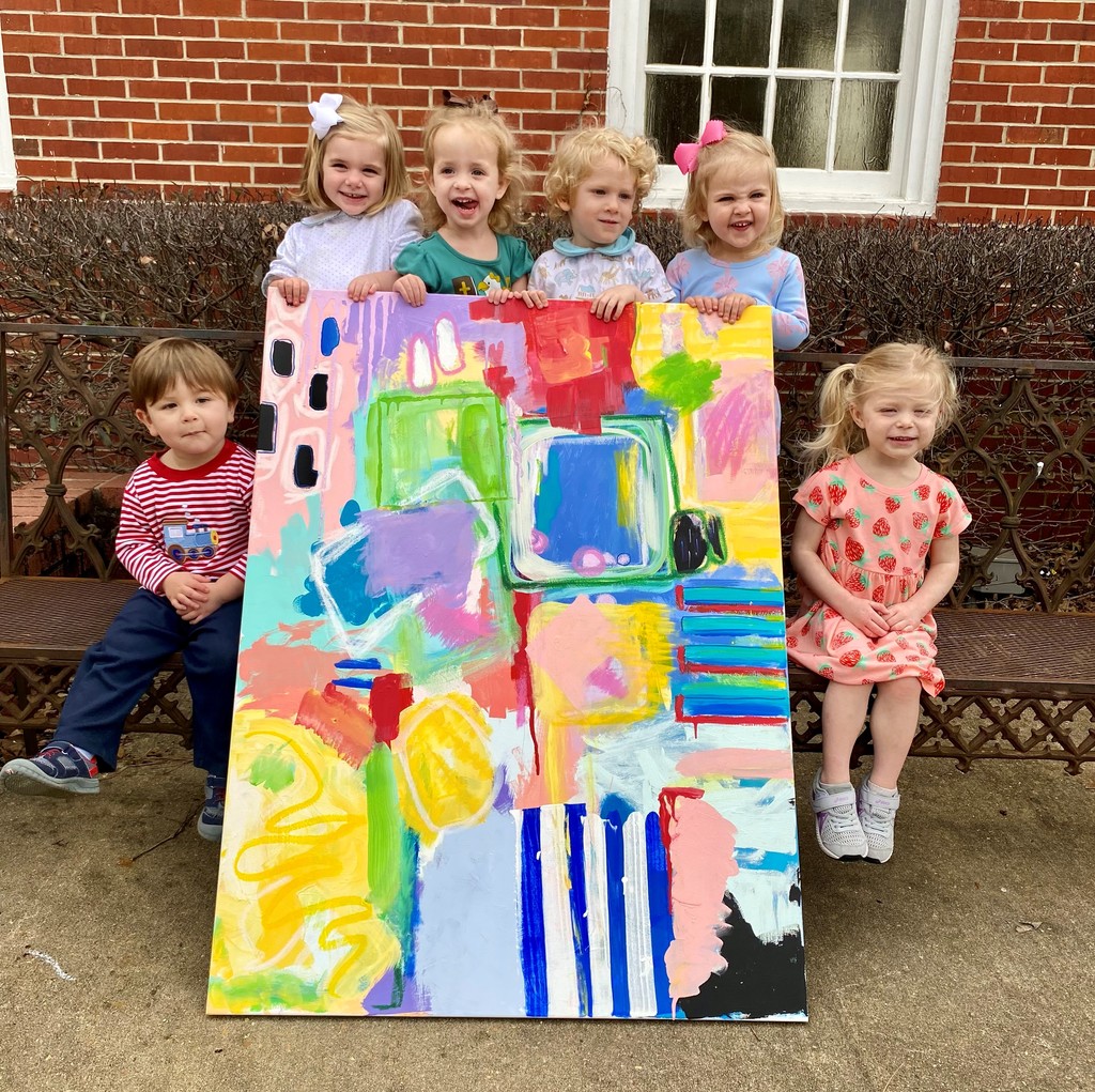 Showstopper! Each 2K student used a unique color to create a large collaborative abstract painting. Each child's name and colored thumbprint are recorded on the back of this special piece. The winning bidder will truly have a treasure!