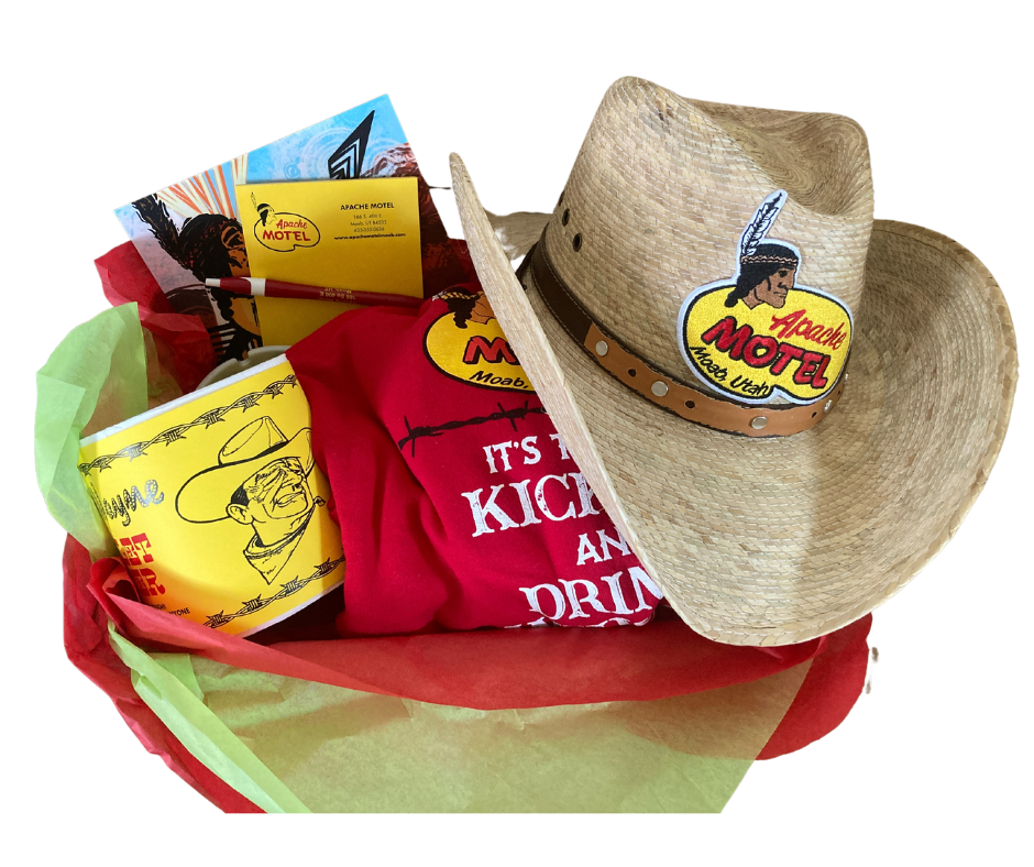 The highest bidder for this item will receive a basket filled with Apache Motel swag, including a cowboy hat, hooded zip-up sweatshirt (size large), John Wayne toilet paper, and more, AND a certificate for a two night weekday stay (Monday-Thursday) at the historic Apache Motel!