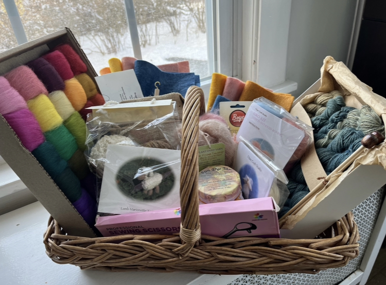 Combed virgin merino wool set, 100% alpaca yarn set, plant dyed wool felt set, plant dyed mohair yarn, beginners spindle spinning kit, lamb marionette knitting kit, bird and angel with plant dyed roving, sun dye jar kit, sewing scissors, hand made wooden knitting needles, and circular knitting needles.