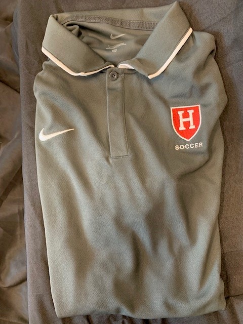 Men's Large Nike Grey Dri-Fit Polo with Harvard Shield and "SOCCER" underneath on chest