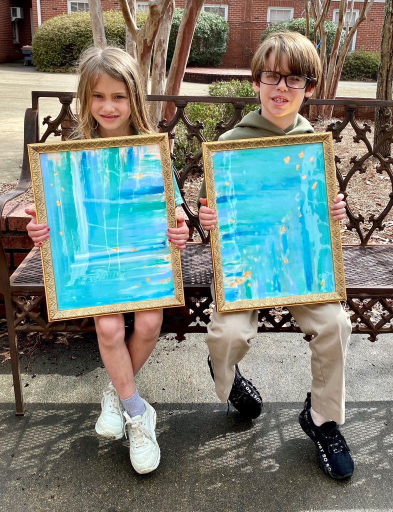 This beautiful set was created by the students in Mrs. Abraham and Mrs. O'Neal's 1st grade classes. The students each marble finger painted the design, and the piece was finished off with resin, gold leaf, and a custom gold frame. The students signed the back and adorned each piece with a special Bible verse. Each frame measures 13x17 inches, and this is sold as a set.