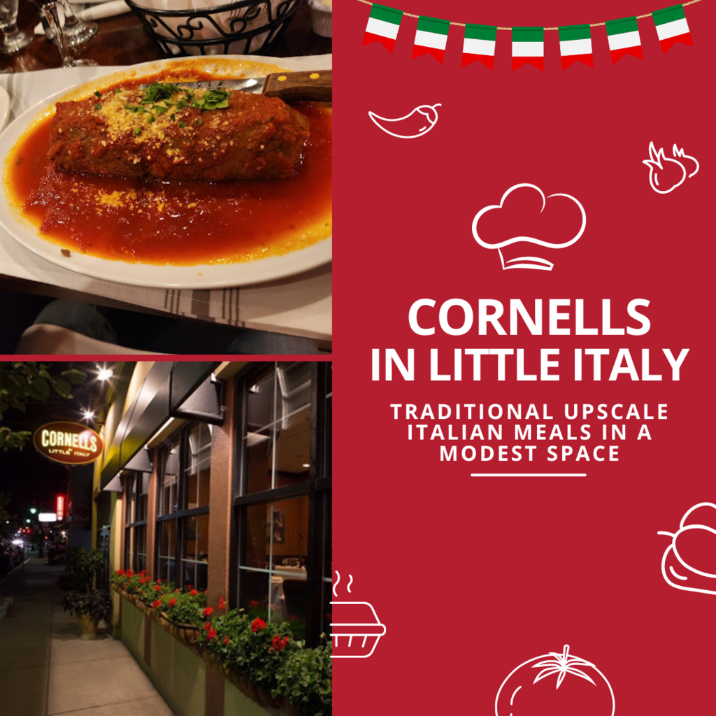 Dine at Cornells in Little Italy and enjoy delicious traditional upscale Italian foods like Linguni or Penne Pastas served with red or white sauce or choose from plenty of seafood options and Filet Mignon!