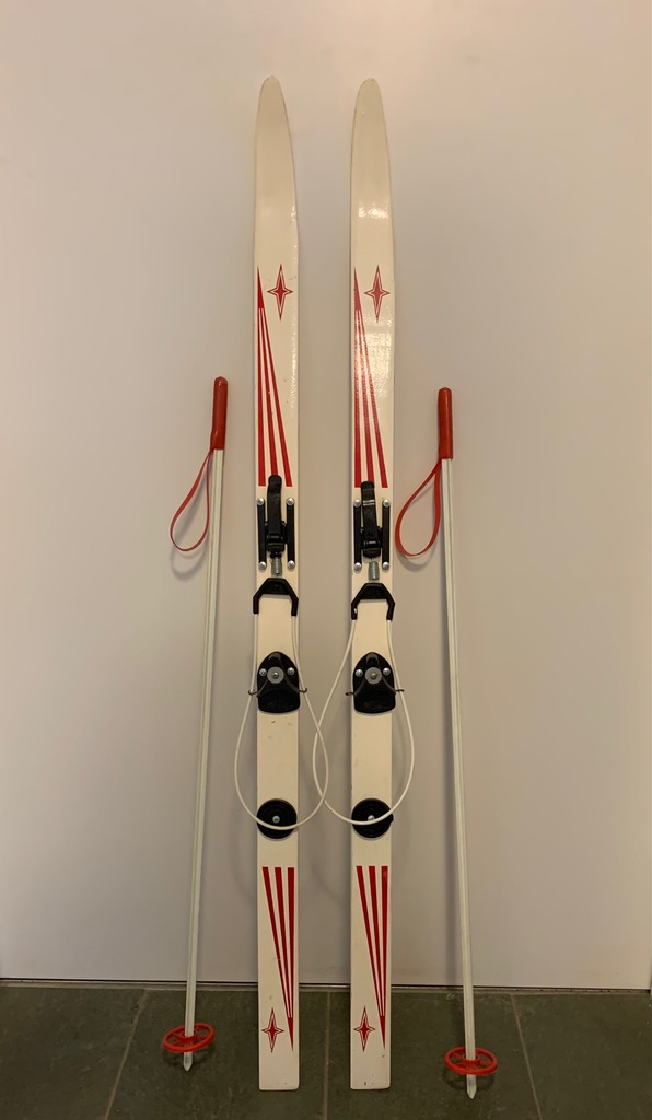 Plastic children's skis and poles. We don't have any info about them, but they're very sweet! Approx. 4 1/2' long.