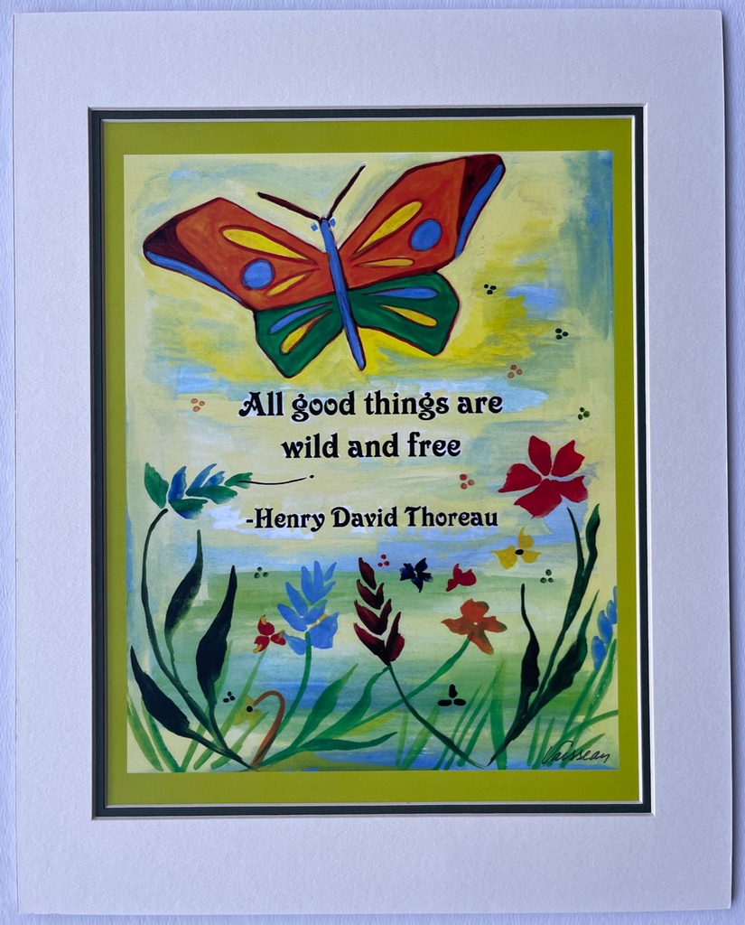 This colorful 11 x 14 inch matted print depicts the quotation by Henry David Thoreau, "All good things are wild and free." It's ready to frame as wall art for any home or office. Designed and offered by Raphaella Vaisseau.