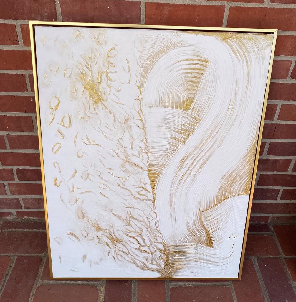 This beautiful textured canvas was created by Mrs. Bailey and Mrs. Farmer's 2nd grade classes. Each child created designs in texture that was finished off with gold leaf to create depth. It was finished in a simple gold floating frame. What a treasure! This piece measures 25 x 31 inches.