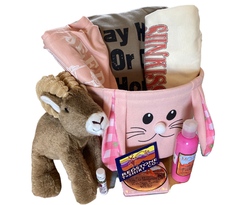 The basket includes: prickly pear moisturizing bar with shea butter, prickly pear lip balm, prickly pear lotion, sage lightweight 'Play Hard or Go Home' hoodie (in medium), pink 'jeep hair don't care' tank top (in large), tan 'sunkissed' t-shirt (in large - may run small) and a big horn sheep stuffie. All of these great items come in an adorable bunny basket.