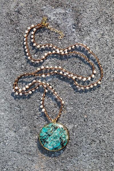 Chrysocolla Bardot Necklace on 32" Handcrochet Pearl and Gold Fill Chain