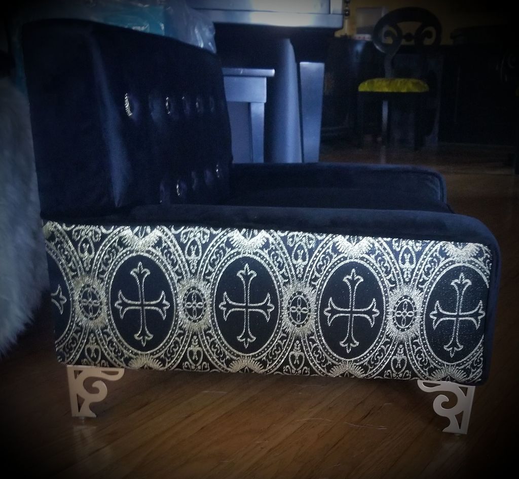 Black velvet with black and gold buttons, black and gold brocade back, ornate metal legs.